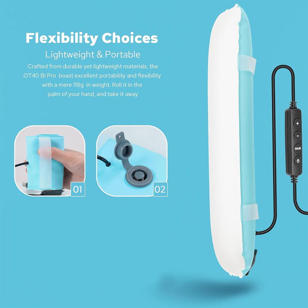 【Léger et portable】 Fabriquée à partir de matériaux doux et durables mais légers, la barre lumineuse vidéo gonflable ZENIKO OT40Bi Pro peut être enroulée et placée dans un petit espace de rangement, et l’emporter très facilement comme lampe de poche quotidienne. 【Lampe vidéo LED professionnelle】 Dotée de 90 LED de haute qualité avec bicolore de 3000K à 6500K, d’une puissance de sortie réelle de 7Ws, d’une luminosité élevée jusqu’à 992lux, CRI 96+, TLCI 98+, la lampe à tube à air ZENIKO OT40Bi Pro garantit une superbe expérience d’éclairage pour tous les créateurs. ✪ Facile à alimenter et polyvalent ✪ : Grâce à son câble de charge USB, le tube lumineux ZENIKO OT40Bi Pro peut être connecté à une batterie externe (adaptateur USB-C fourni) ou à une prise USB pour une alimentation secteur. Convient pour la photographie, le tournage, le vlogging, le streaming en direct, le camping et autres activités en intérieur ou en extérieur. 【Reconnaissance de l’alimentation】 La version Pro de la lampe à tube d’air ZENIKO met à niveau la reconnaissance de l’alimentation lorsque l’alimentation est coupée puis reconnectée, elle s’allume directement à la puissance et à la température précédentes. [Remarque] : lorsque la lumière ne peut pas être allumée avec le dernier réglage en raison d’une alimentation électrique insuffisante, appuyez trois fois sur le bouton d’alimentation (n’appuyez pas en continu), elle démarrera à la luminosité la plus basse et à la dernière température de couleur enregistrée.