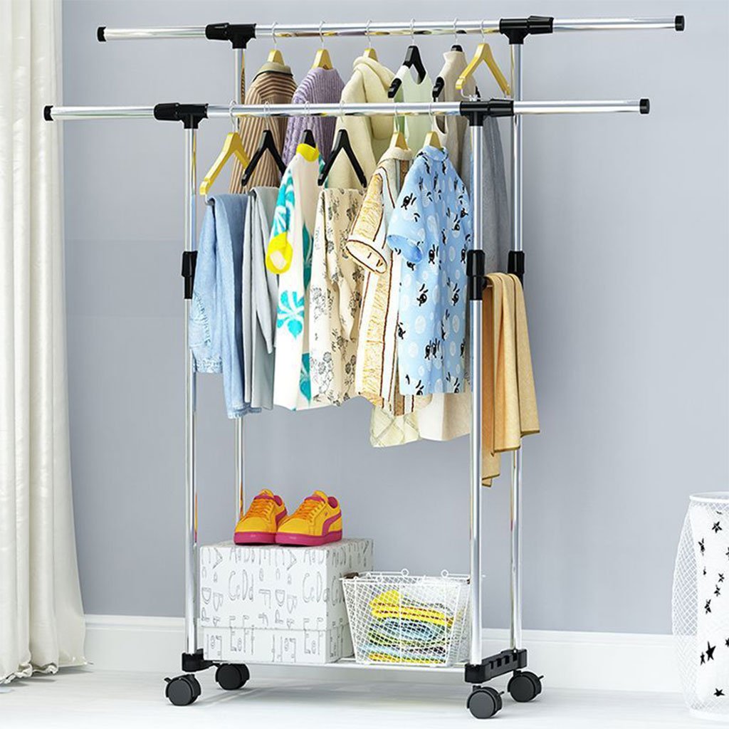 رف ملابس مزدوج محمول بعجلات من الفولاذ المقاوم للصدأ