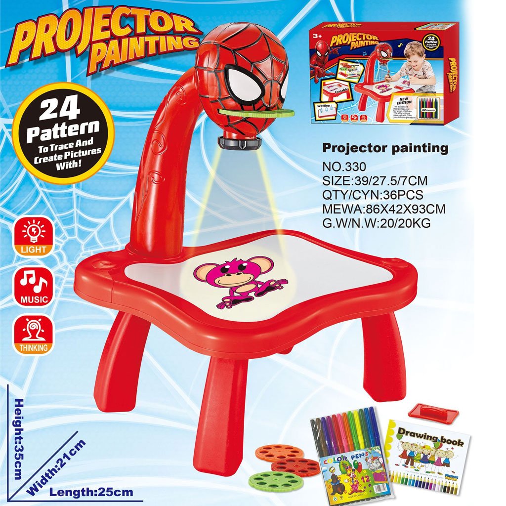 Description du produit Un projecteur fantastique en forme de girafe mignonne qui encouragera sans aucun doute tous les enfants à peindre et à dessiner. Des couleurs vives et chaudes attireront l’attention d’un enfant qui passera beaucoup de temps à peindre ! Comment fonctionne ce speelgoed? Il vous suffit de mettre 3 piles AA, de choisir l’une des six superpositions et de la placer dans la gueule de l’animal. Allumez ensuite le projecteur avec l’interrupteur sur la tête de la girafe et vous pouvez commencer à dessiner ! Les images peuvent être créées directement sur la table du projecteur et essuyées avec l’éponge incluse lorsque vous avez fini de jouer. Cette tactique signifie que vous n’avez pas besoin de beaucoup de cartes ou de livres de coloriage. Ce sera une solution beaucoup moins chère et réutilisable. Mais si vous voulez montrer les belles images de votre photo à l’intérieur de votre maison, vous pouvez mettre une feuille vierge sur le comptoir. L’image affichée sera aussi visible que sur un dessus de table vide. Le dessin fini peut être accroché au koelkast ou encadré – pour que tout le monde puisse l’admirer ! L’ensemble contient 12 stylos de couleur avec lesquels vous pouvez facilement créer tous les motifs inclus ! Jusqu’à 6 superpositions attachées contiennent un total de 36 images différentes. Si vous les fabriquez tous, votre enfant s’amusera beaucoup ! Le dessin a un grand effet sur la dextérité manuelle de l’enfant – il améliore la précision de la main et celle des doigts. Plus tôt il commencera à peindre, plus il lui sera facile plus tard de maîtriser des compétences telles que l’écriture. La Créativité et l’imagination ne sont pas en reste – créer des images différentes, nouvelles et plus complexes permettra à tout enfant de s’épanouir ! En jouant avec le projecteur, vous apprenez également à distinguer les couleurs, à créer et à reconnaître de nouvelles formes. Ce sera formidable comme cadeau – cela apportera non seulement un immense plaisir, mais aussi un bon développement de l’enfant. Cela pourrait être le début de la grande passion de votre enfant ! Contenu du Kit : Une table avec un projecteur 6 superpositions avec 6 images à redessiner Éponge abrasive Carnet de dessin pour photos Set de 12 marqueurs Matière : plastique Âge de l’enfant : 3+ Alimentation : 3 piles AA (non incluses) Dimensions : Tableau : 25cm x 21cm x 35cm Hauteur du plateau de table depuis le sol : 13 cm Dimensions plateau : 25cm x 21cm La hauteur du projecteur à partir du dessus de table : 16,5 cm Emballage : 26 cm x 22,5 cm x 8 cm
