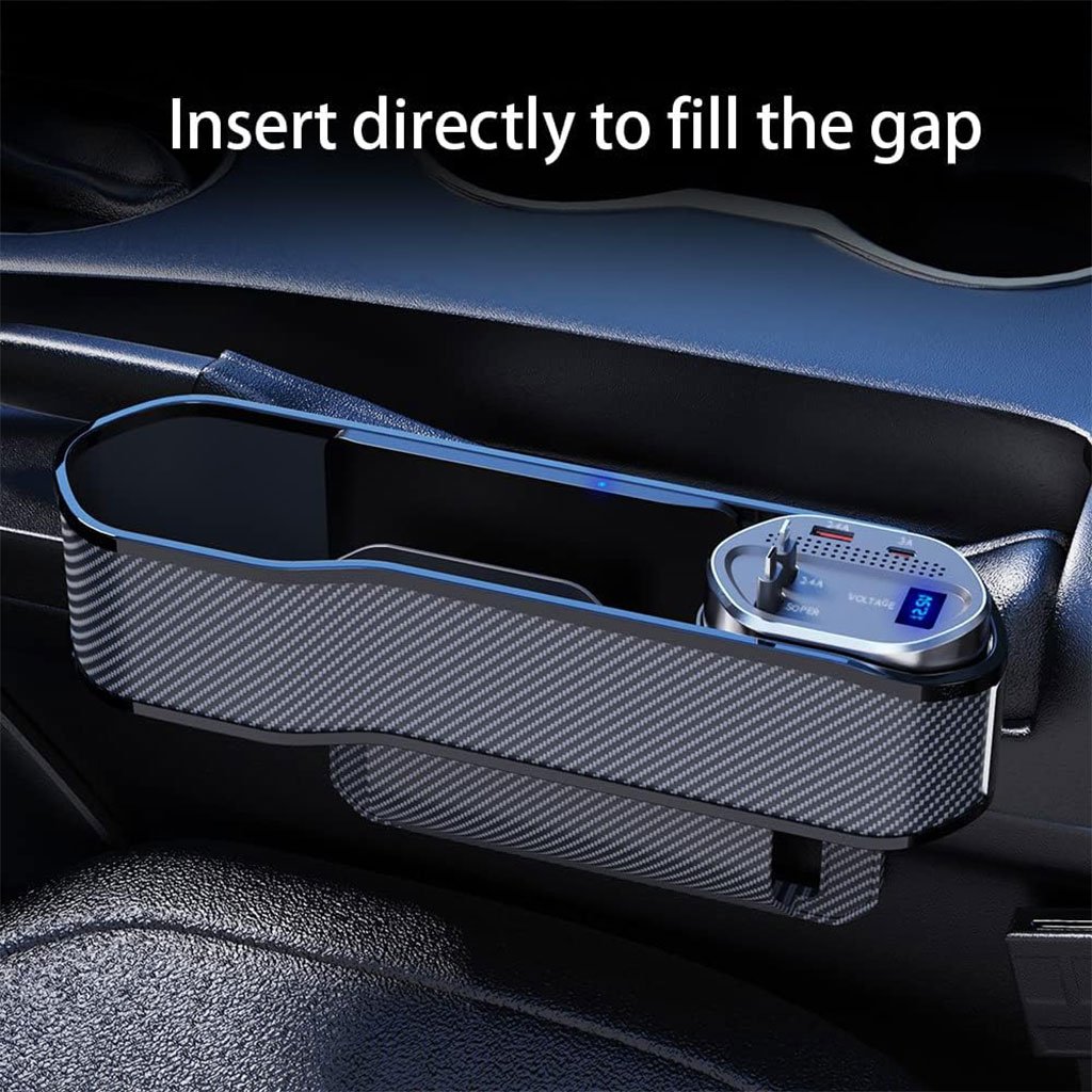 Compatibilité : Ce coffre de rangement pour l’espace entre les sièges est compatible avec la plupart des voitures. Son installation est simple : il suffit de l’insérer entre le siège et la console centrale. Veuillez consulter la deuxième photo pour vérifier la compatibilité. Construction durable : Fabriqué avec des matériaux haut de gamme et arborant une élégante texture en fibre de carbone, notre cache-siège auto est conçu pour durer. Il résiste à l’usure quotidienne, aux éclaboussures et aux rigueurs d’une utilisation constante. Charge rapide : Câble rétractable USB-C, câble rétractable iOS, port USB-C, port USB-A et chargeur sans fil inclus. Longueur maximale rétractable : environ 80 cm. Permet de charger plusieurs téléphones simultanément. Remarque : Retirez la coque de votre téléphone avant d’utiliser le chargeur sans fil. Intérieur organisé : rangements supplémentaires pour vos effets personnels tels que smartphone, portefeuille, cigarettes, clés, pièces de monnaie, carte de crédit, stylos, lunettes de soleil, etc. Améliorez l’intérieur de votre voiture grâce à un design élégant et stylé. Conduite pratique et sûre : branchez-le simplement sur l’allume-cigare et c’est parti ! Améliorez votre expérience de conduite grâce à cet organiseur d’espace entre les sièges auto, pour plus de confort, de sécurité et un habitacle impeccable. Idéal pour les longs trajets ou les déplacements quotidiens. Un cadeau parfait pour un anniversaire, Noël, le Nouvel An, etc.