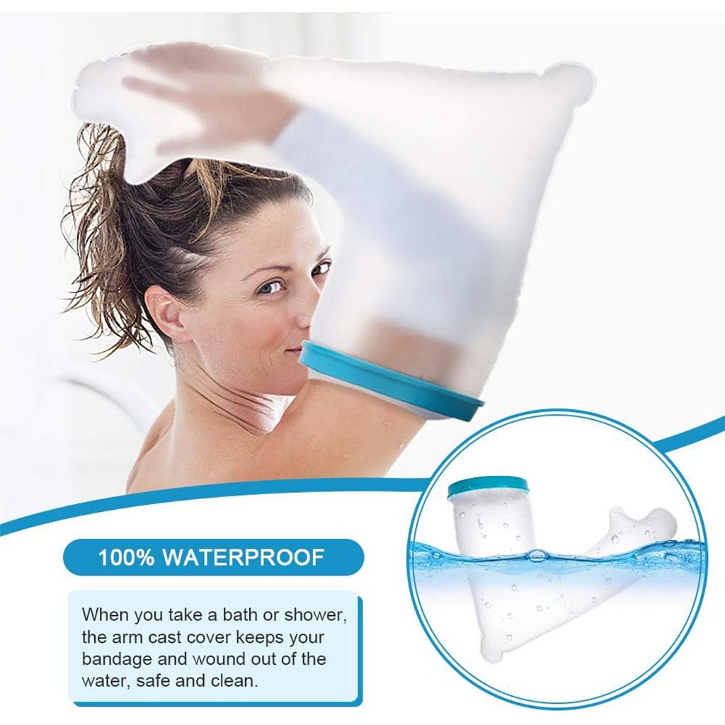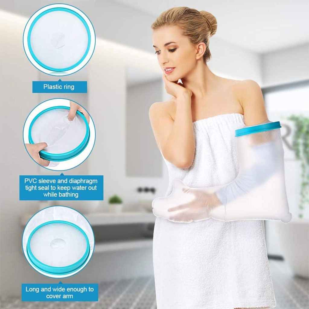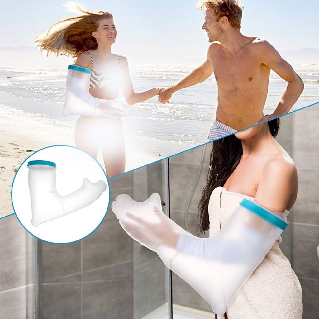 COUVERCLE DE BRAS DE DOUCHE LÉGER : Le caoutchouc de l’ancien modèle laissait facilement des traces sur la peau. Le couvre-plâtre complet de l’ancien modèle adhère facilement au bras. Le caoutchouc du nouveau couvre-plâtre complet est si souple qu’il ne laisse aucune trace sur la peau et ne colle pas. La membrane élastique scellée ne bloque pas la circulation sanguine. Empêche efficacement la pénétration de l’humidité : Idéal pour la douche et le bain. Particulièrement adapté aux personnes se remettant d’une opération ou de problèmes de peau. La housse imperméable protège la partie blessée. Recommandé pour la douche, le bain ou les activités de plein air après une blessure, une opération, un accident ou en cas d’affections telles qu’éruptions cutanées, brûlures, problèmes de peau ou plaies. COUVERTURE DE PLÂTRE IMPERMÉABLE POUR BRAS : Cette housse de plâtre imperméable est idéale pour la douche et le bain. D’une longueur de 60 cm, elle s’étend jusqu’au bras, ce qui la rend idéale pour couvrir les blessures aux doigts et au bras. Matériau léger, hygiénique et lavable, elle ne colle pas au bras. L’ouverture centrale flexible, extensible jusqu’à 15 cm de diamètre, est suffisamment large pour permettre le passage du plâtre, mais suffisamment serrée pour empêcher l’eau de passer. PROTECTION DE L’ENVIRONNEMENT : Notre membrane de protection pour plâtre est fabriquée en silicone de qualité médicale. Le manchon est en PVC, un matériau antidérapant qui ne colle pas au bras. Sans latex, sans odeur ni goût, il est facile à laver. Son ouverture élastique souple permet un enfilage et un retrait faciles et indolores. Dimensions : 60x15cm