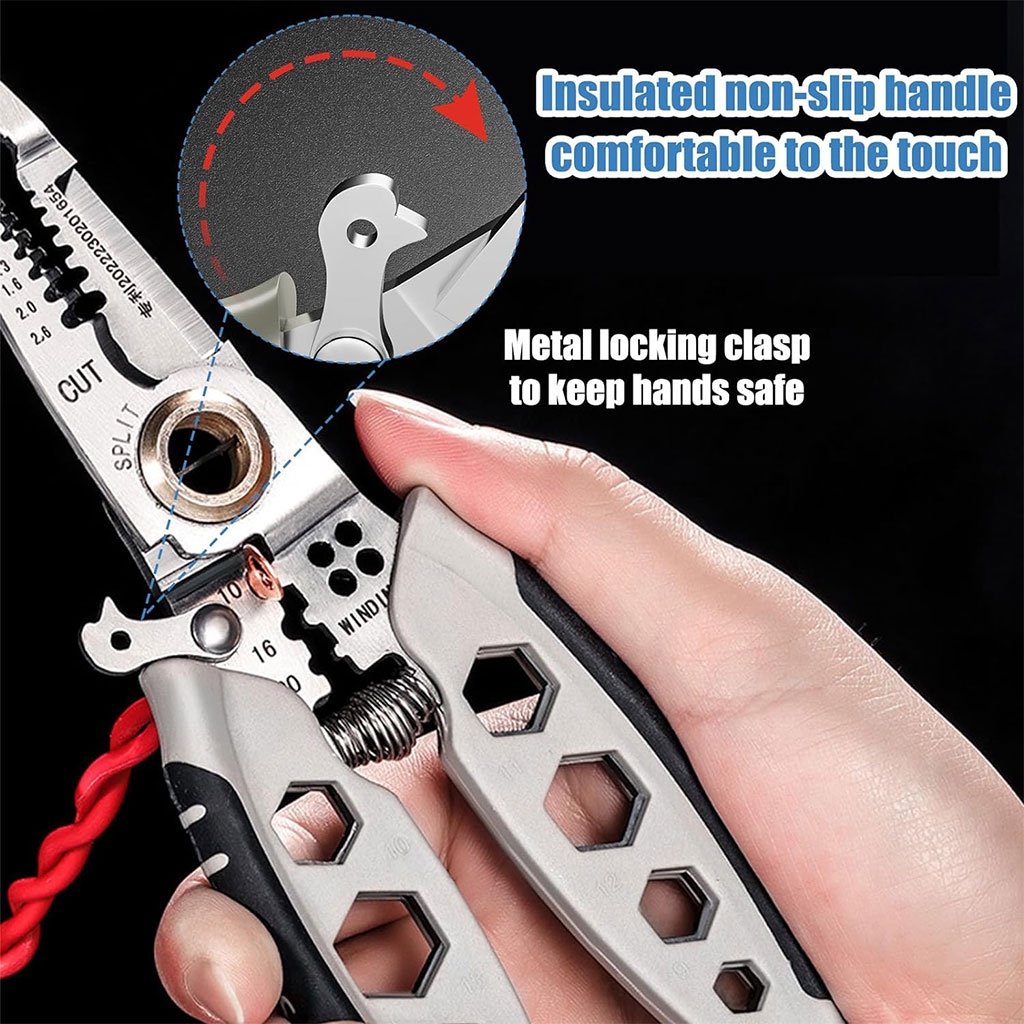 - Améliorer l’efficacité: Une pince à dénuder pratique multifonction pour une large gamme de travaux électriques tels que dénuder, couper, sertir, enrouler, desserrer, tordre et serrer des fils. Il n’est pas nécessaire de changer fréquemment de pince lors de l’utilisation, ce qui améliore l’efficacité du travail.