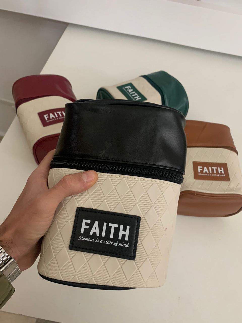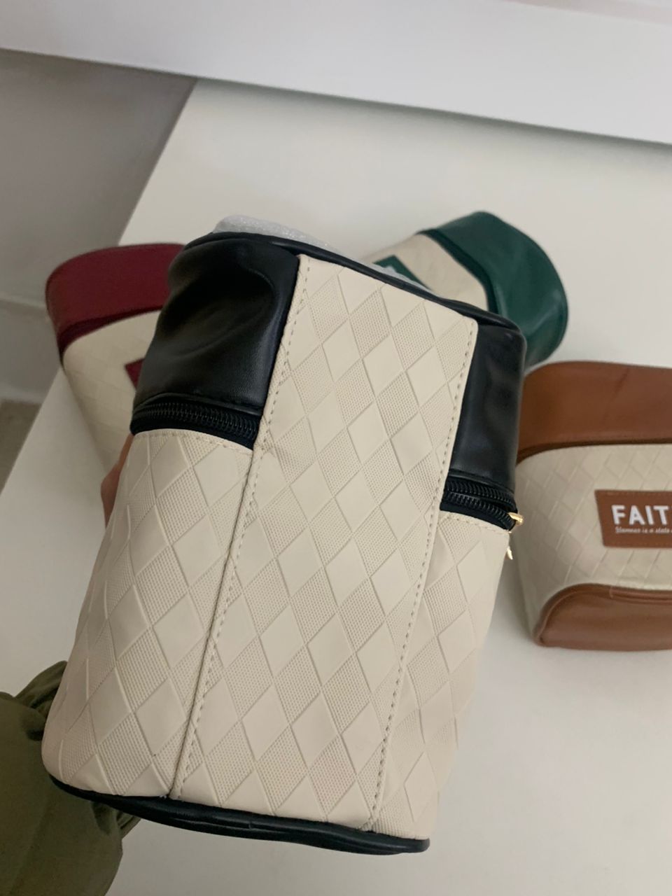 - خامة ممتازة: جلد صناعي مبطن بالبوليستر، أنيق بنقشة المربعات، متين وسهل التنظيف لحماية أدواتك الشخصية ومستحضرات التجميل.